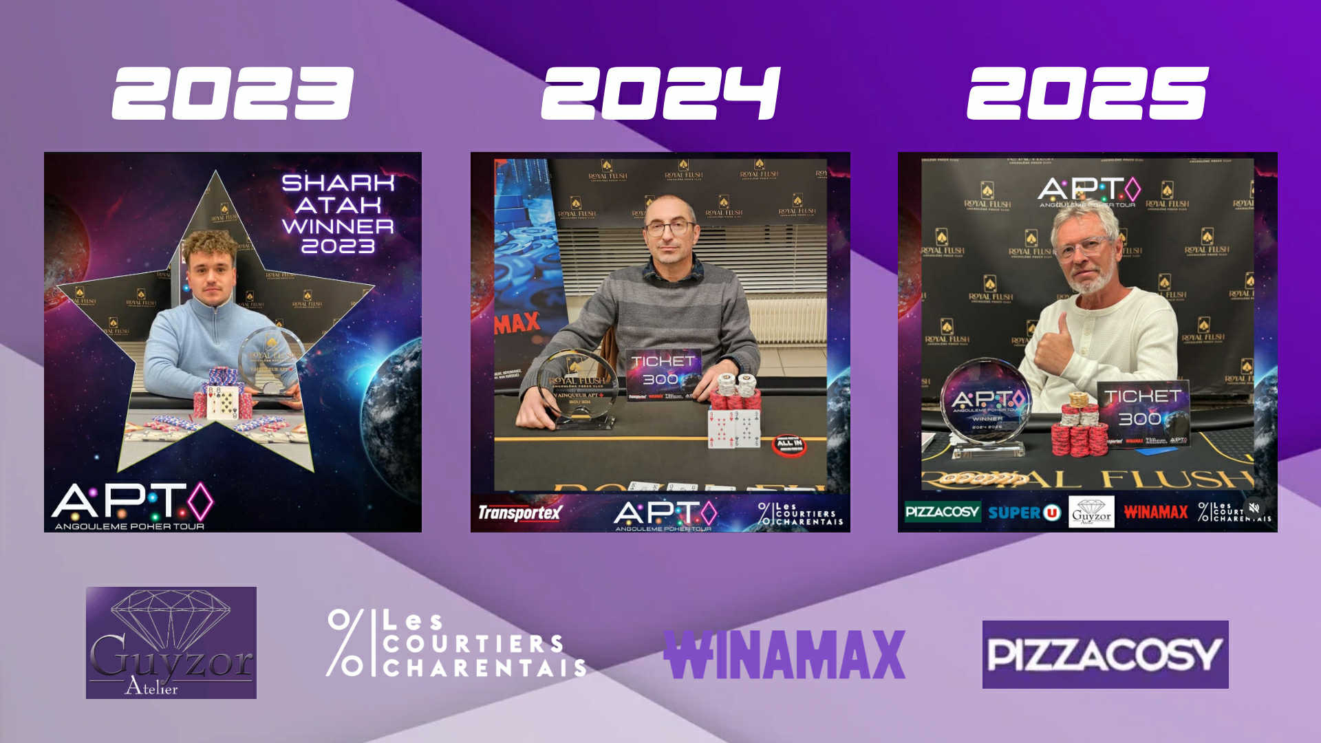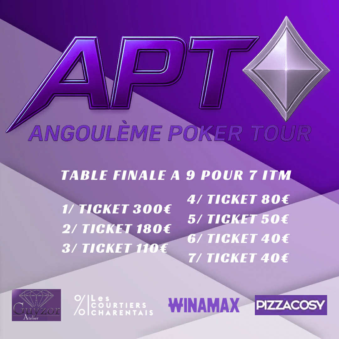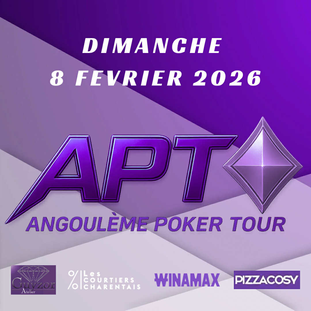 ANGOULEME POKER TOUR – ÉDITION CARREAU APT #3 – Saison 2025 / 2026 Le 3ème chapitre du Angoulême Poker Tour s’ouvre avec l’Édition Carreau, une manche pensée pour les joueurs qui privilégient la justesse, la discipline et la maîtrise du jeu. Le Carreau, symbole de construction et de précision, s’incarne ici dans une identité violette, profonde et raffinée, pour un APT à l’esthétique premium et à l’exigence élevée. Un trophée à conquérir Un ticket live de 300 € pour le vainqueur Une date décisif dans la course à la Table des Champions Petit-déjeuner & repas du midi offerts par le club, dans une atmosphère élégante et conviviale, fidèle à l’ADN Angoulême. Inscription obligatoire en amont (nombre de places limité – organisation optimale) APT CARREAU |