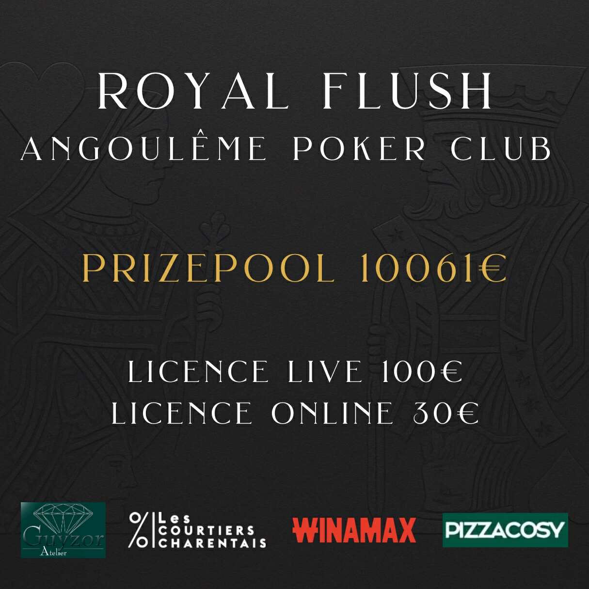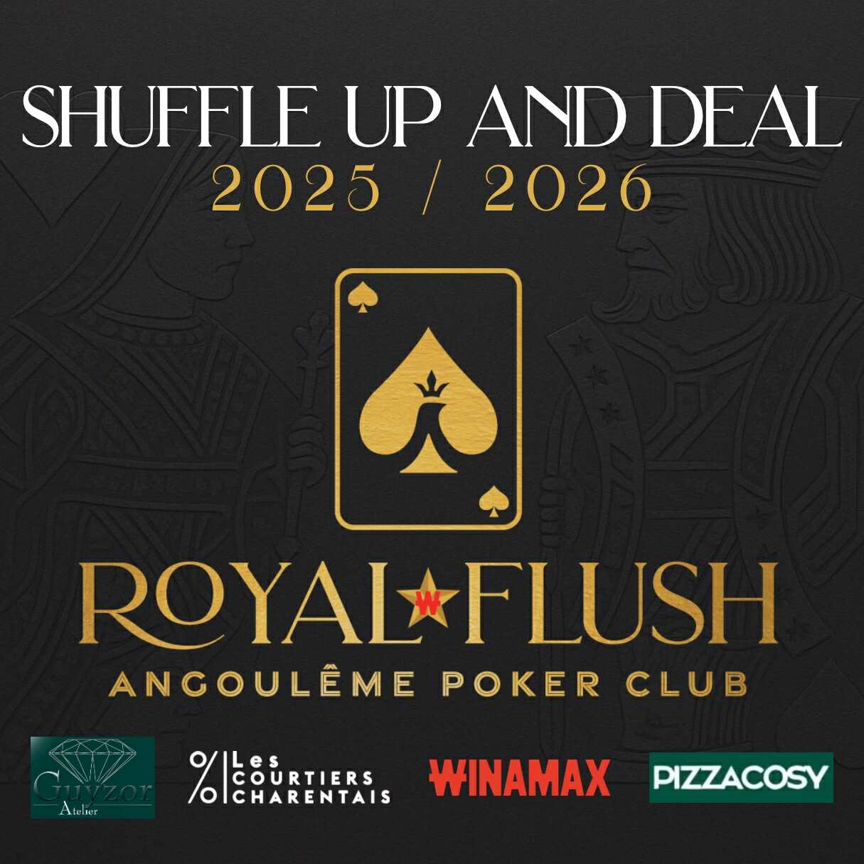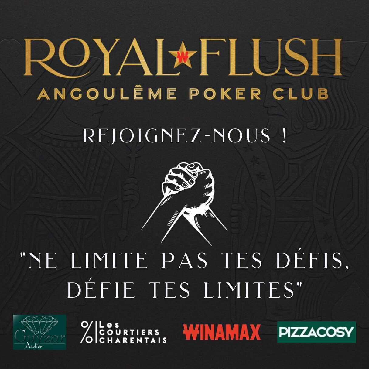 Fondé en Janvier 2008, Royal Flush Angoulême Poker Club (association Loi 1901) compte une centaine d'adhérents qui se réunissent de plus en plus nombreux chaque semaine pour partager ensemble leur passion.